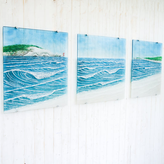 Triptych Wave Frames including 2 at 25cmx45cm(10x17") + 1 at 45x45cm(17x17") | 3 Wave Large Sea Beach Lighthouse Fused Glass Frames