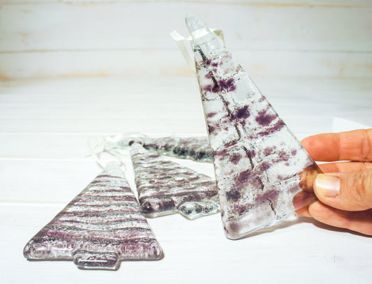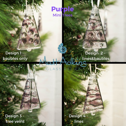3 to 6 Mini purple fused glass hanging trees 8cm, 3" - with ribbon and organza bag