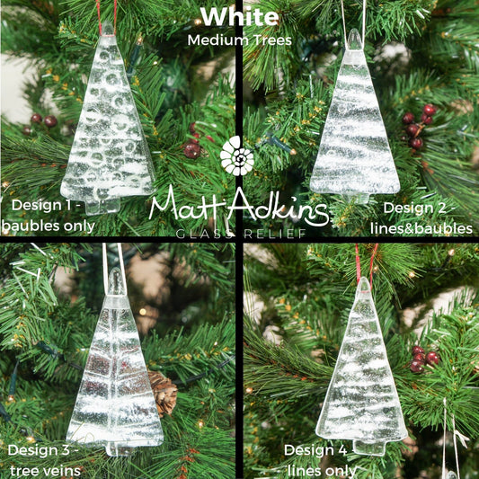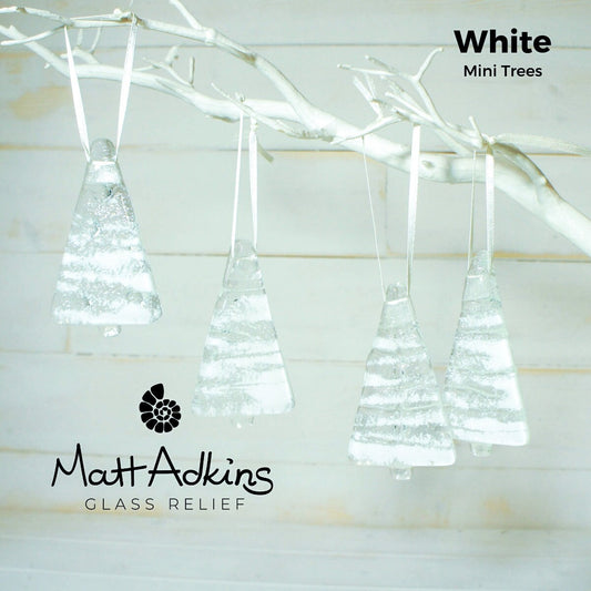 3 to 6 Mini white Christmas fused glass hanging trees 8cm (3") - with ribbon and organza bag