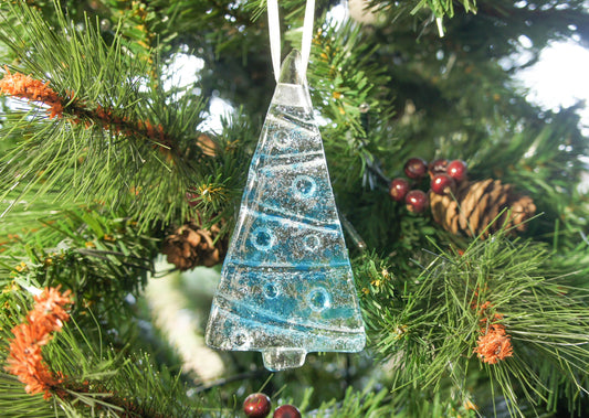 3 to 6 Mini Blue Glass Christmas Tree Decorations - Hanging - 8cm(3") with ribbon and organza bags