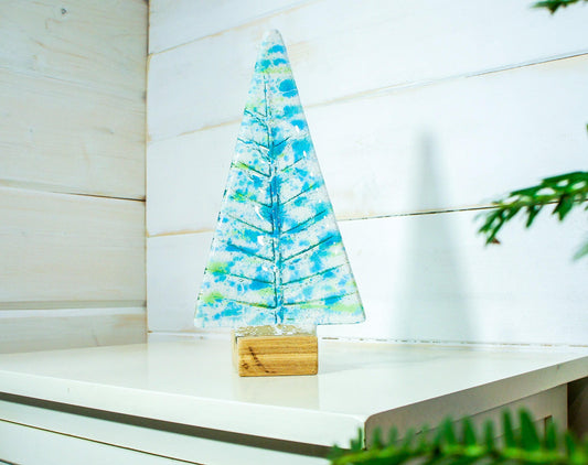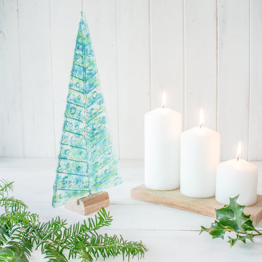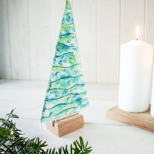 Large Fused Glass Christmas Tree Blue Green 22cm (8 1/2" tall) - Freestanding in wooden blocklock