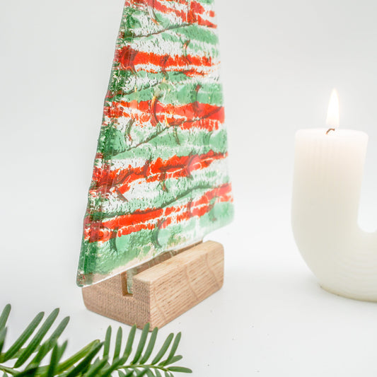 XL Green&Red Fused Glass Christmas Tree Decoration - Freestanding - 32cm/12 1/2" with wooden block