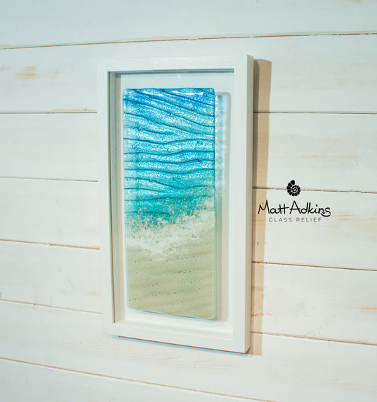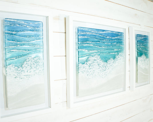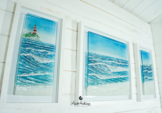 Triptych Wave Frames including 2 at 25cmx45cm(10x17") + 1 at 45x45cm(17x17") | 3 Wave Large Sea Beach Lighthouse Fused Glass Frames
