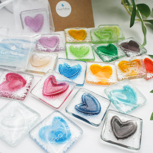 Fused Glass Heart Pocket Hug in organza bag and gift enveloppe