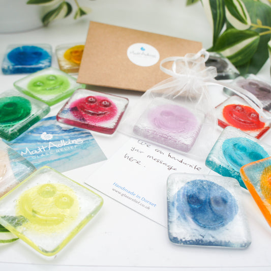 Fused Glass Pocket Hug Simley Face in organza bag and gift enveloppe