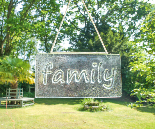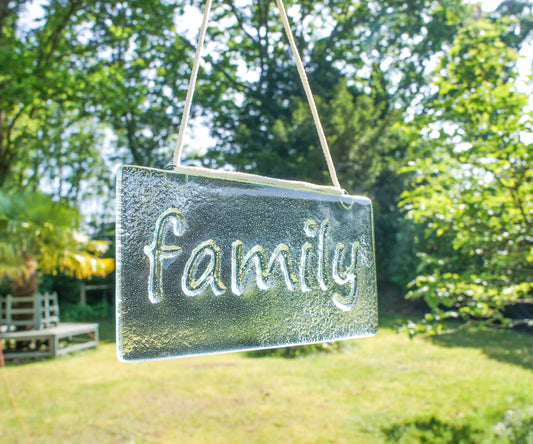 Family Suncatcher 20x10cm(8x4"), Family Sign Fused Glass Clear Hanging Suncatcher, Family Word Sign, Handmade Window Decoration Art