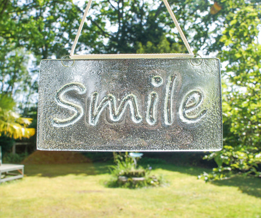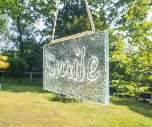 Smile Suncatcher 20x10cm(8x4")| Smile Sign Fused Glass Clear Hanging Suncatcher | smile word sign | Handmade Window Decoration Art