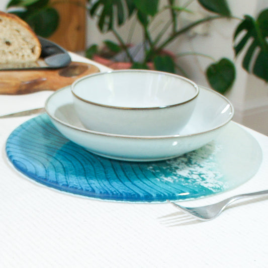 Beach Placemat + coaster, Turquoise Beach Fused Glass Sea Table Mats 30x20cm(11 3/4x8 1/4") with coaster 10cm, Coastal House Glass Tableware