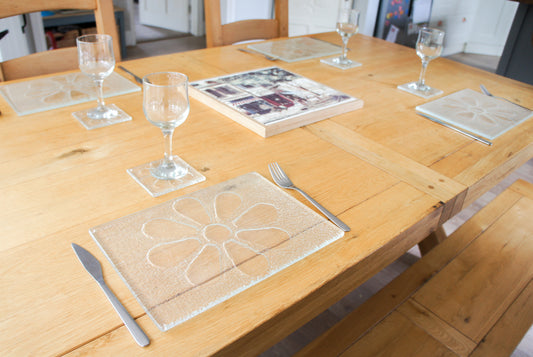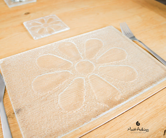 Daisy Glass Placemats + Matching Coasters 30x20cm(12x8"), clear fused glass dinner set, table mats, place mat set, wedding gifts, sea glass