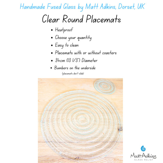 Clear Round Glass tablemats and Coasters Set Large, fused glass placemats heatproof 34cm (13 1/3) with coasters, dinner set, dinner service