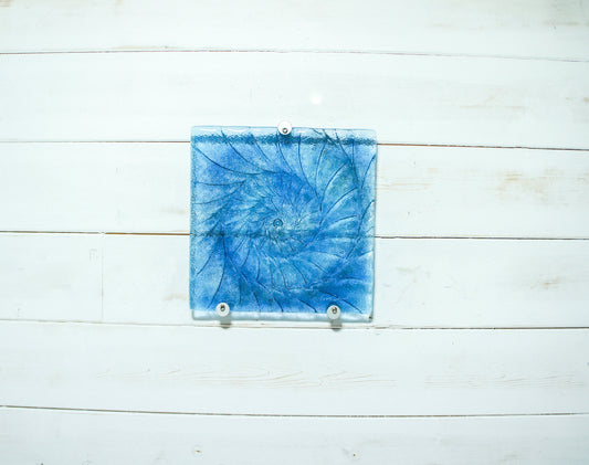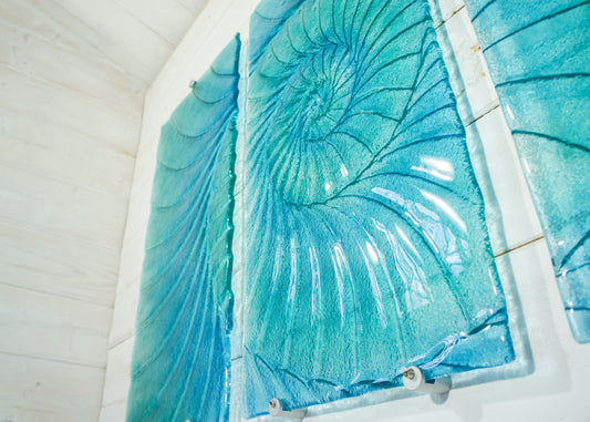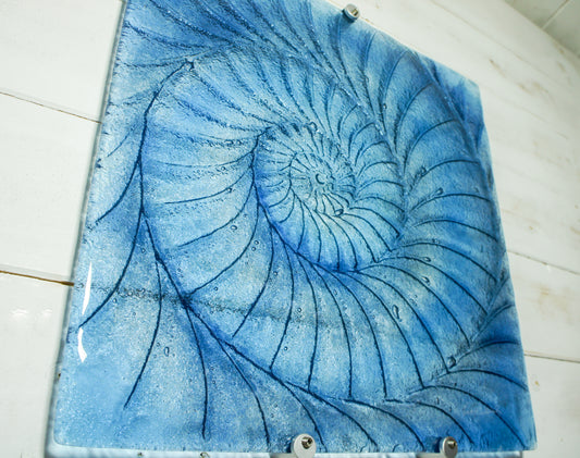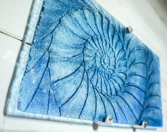 Glass Ammonite 22x22cm(9x9"), Dark Blue Ammonite Glass Wall Panel with 3 fixings, Shell Sculpture Wall Art, Fossil Nautilus Glass Art