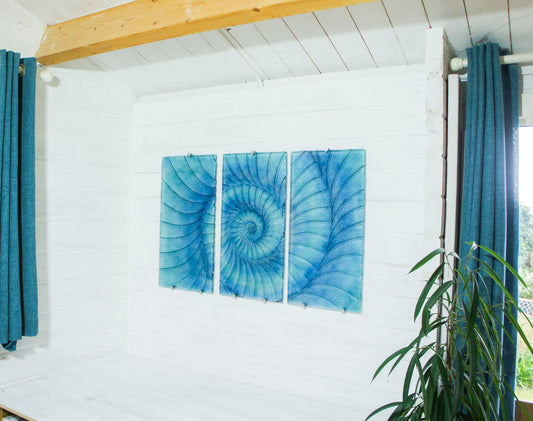 Triptych Ammonite Wall Art OVERALL 100x60cm (40x23") incl. gaps and 9 fixings - Blue/Turquoise/Midnight Blue - Each Panel 30x60cm (12x23") Large Portrait Fossil Fused Glass Wall Art