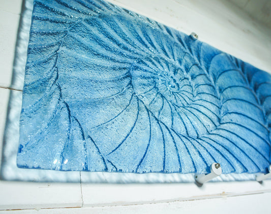 Large Ammonite Wall Art 56x26cm (22x10"), Blue Swirl Landscape Fossil Fused Glass Wall Abstract Art, Nautilus Picture, bathroom decor