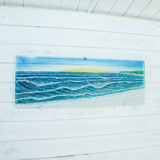 Bay Wave Glass Sunset Art 96x47cm(38x18"), extra large wall art, fused glass large landscape wall art, teal turquoise blue wall decor