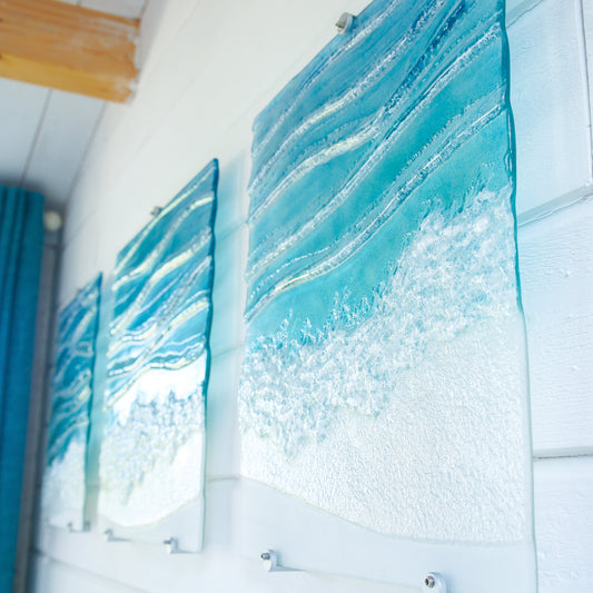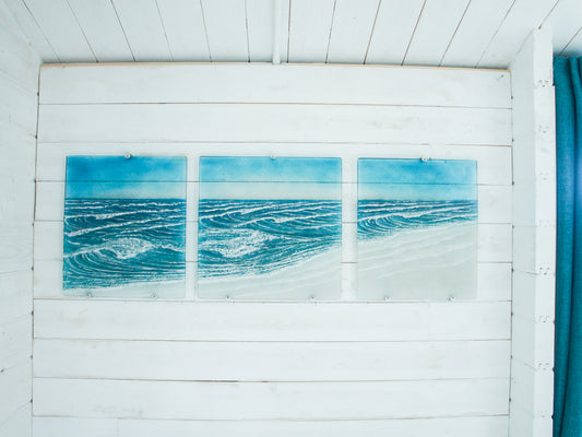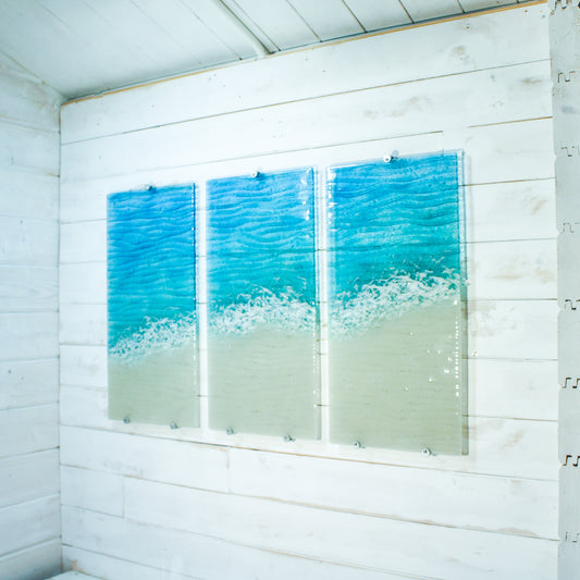 Triptych Toe Tickling Tide 3 piece wall art fused glass, left&right panels at 35x40cm(14x16") middle panel at 40x40cm(16x16"), with fixings