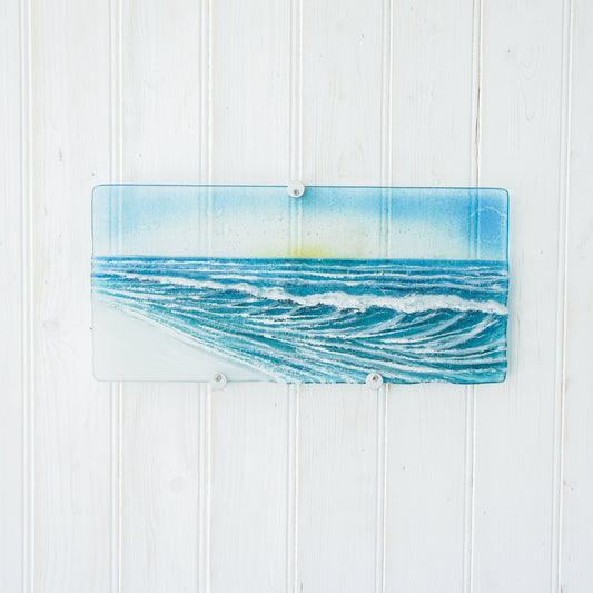 wave panel fused glass wall art with sun 40x20cm(15" 3/4 x 7" 7/8) with fixings