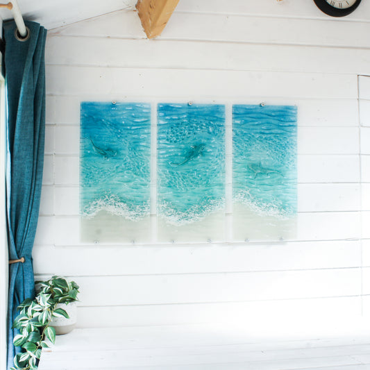Shark Paradise 3 piece Wall Art Triptych fused art OVERALL 100x60cm (40x23"), each panel is 30cm wide and 60cm high (Copy)