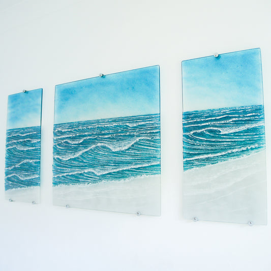 Large Triptych Wave Glass Art Wall Panels - Left&Right 30x60cm (12x24")/Middle 60x60cm (24x24") with 9 fixings