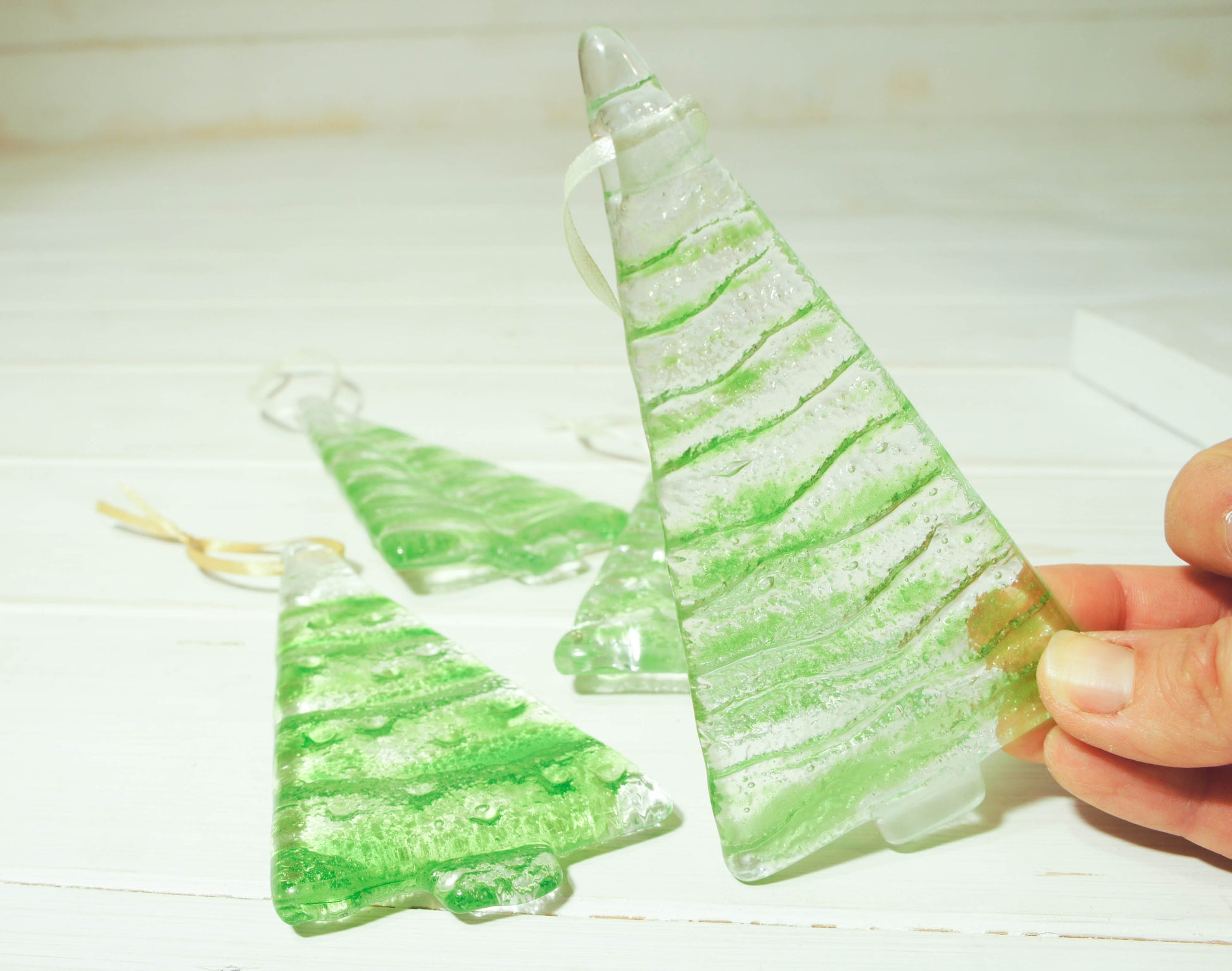 2 to 6 Medium Lime Green Glass Trees - Hanging - 12cm/3 3/4" - with ribbon and organza bag