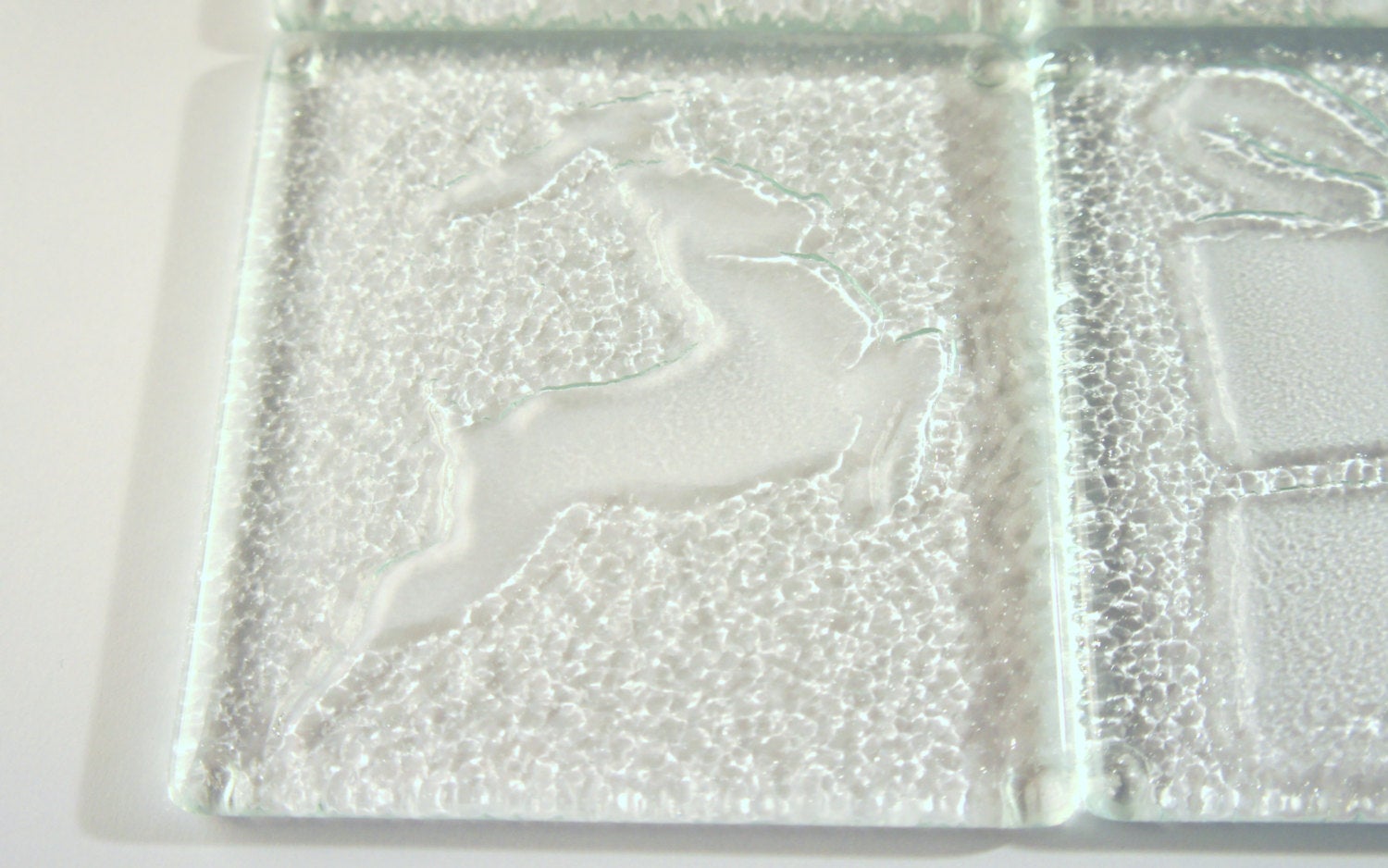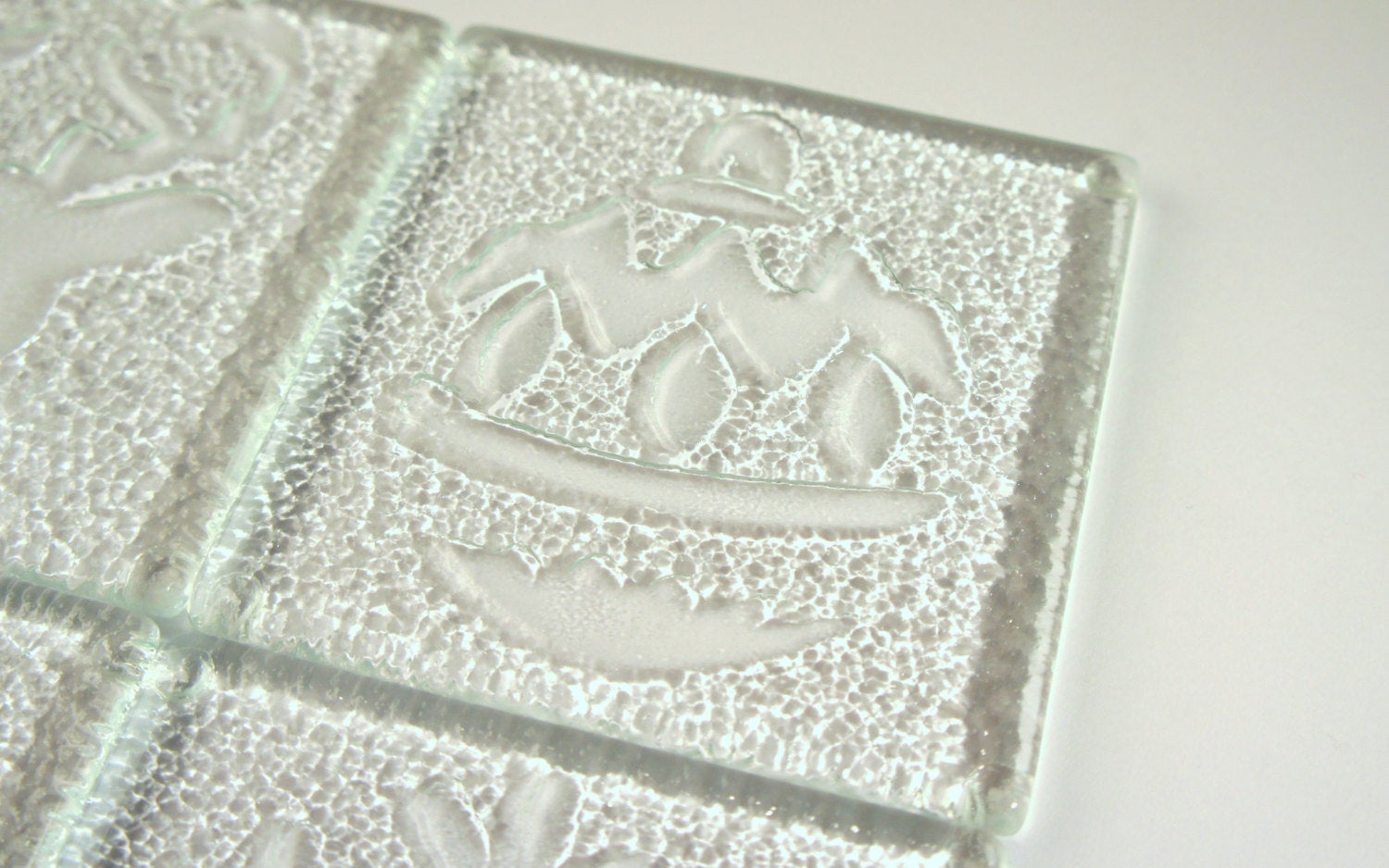 The unique low relief formed to the underside of these clear coasters was inspired by Christmas. The top of the coasters are smooth as the relief is formed to the underside of the coasters.
