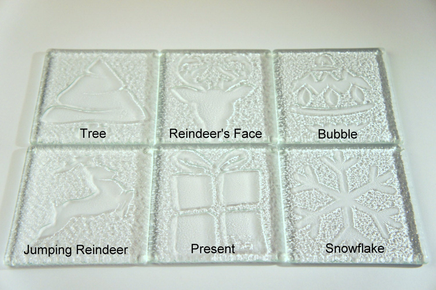 This item contains a set of 6 coasters 10cmx10cm or 4.13x4.13inches, with 4 bumpers on the underside of each coaster, please choose your designs, all different or all of the same: Christmas Tree, Reindeer's Face, Christmas Bubble, Jumping Reindeer, Present or/and Snowflake, please add a note to seller when placing your order or send a separate conversation.