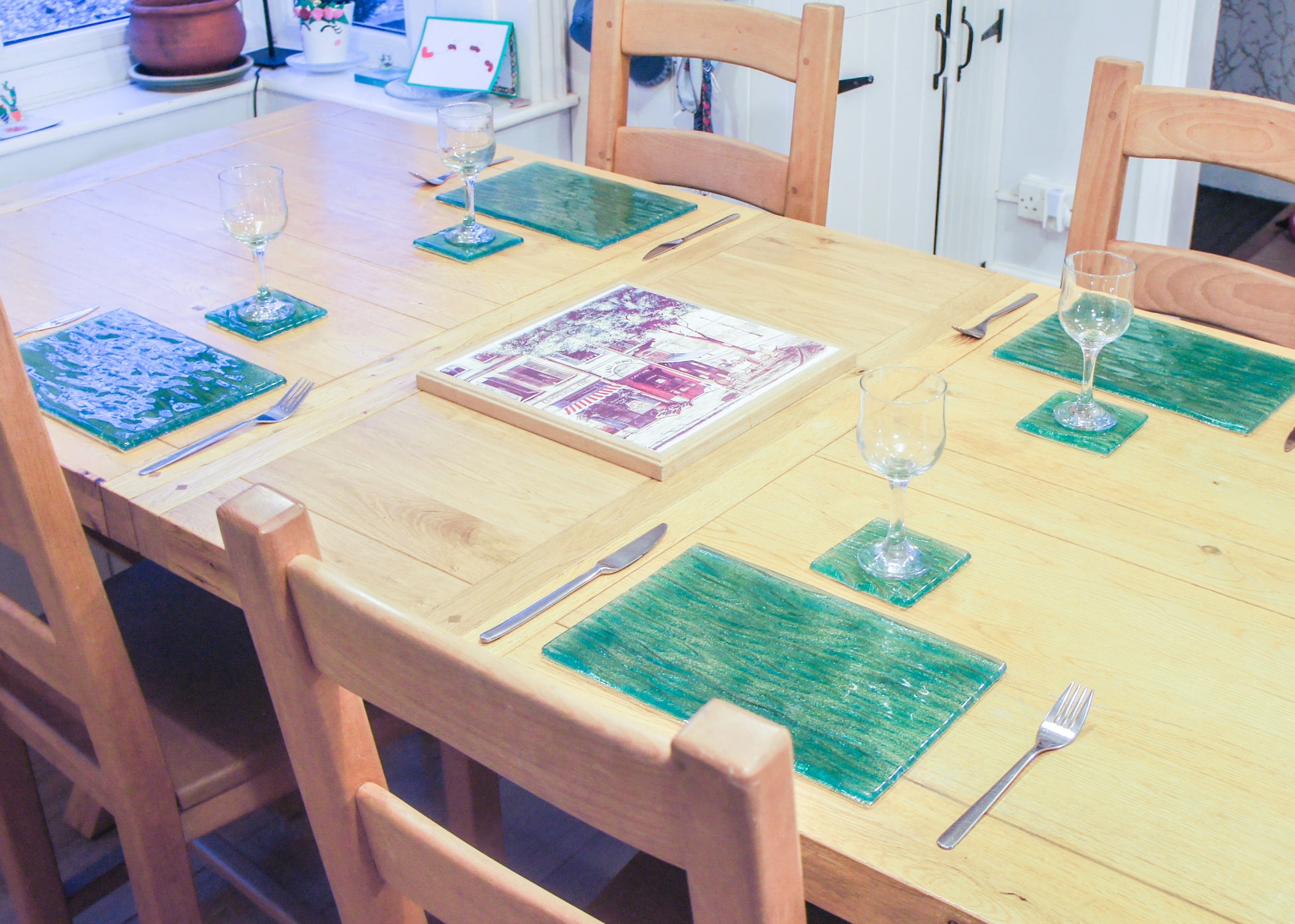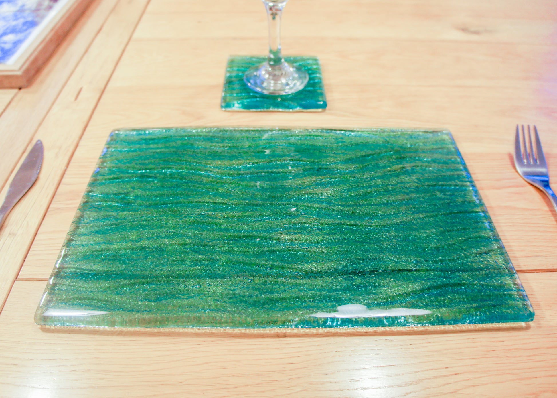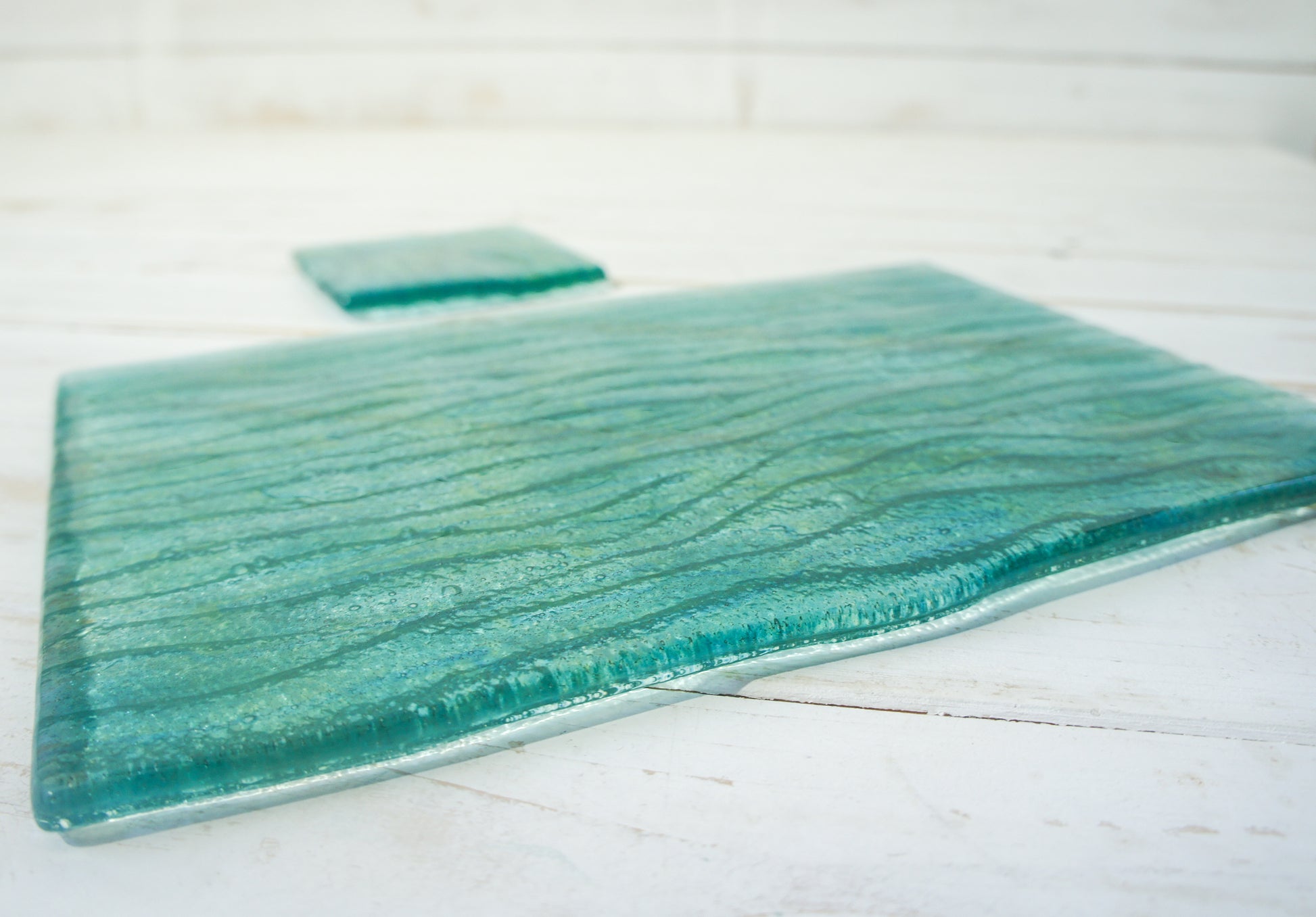 This glass placemat with its coaster illustrate a seabed texture using colours to accentuate the motion of the water with turquoise and blue lines throughout, a set would make the perfect gift for a beach house.