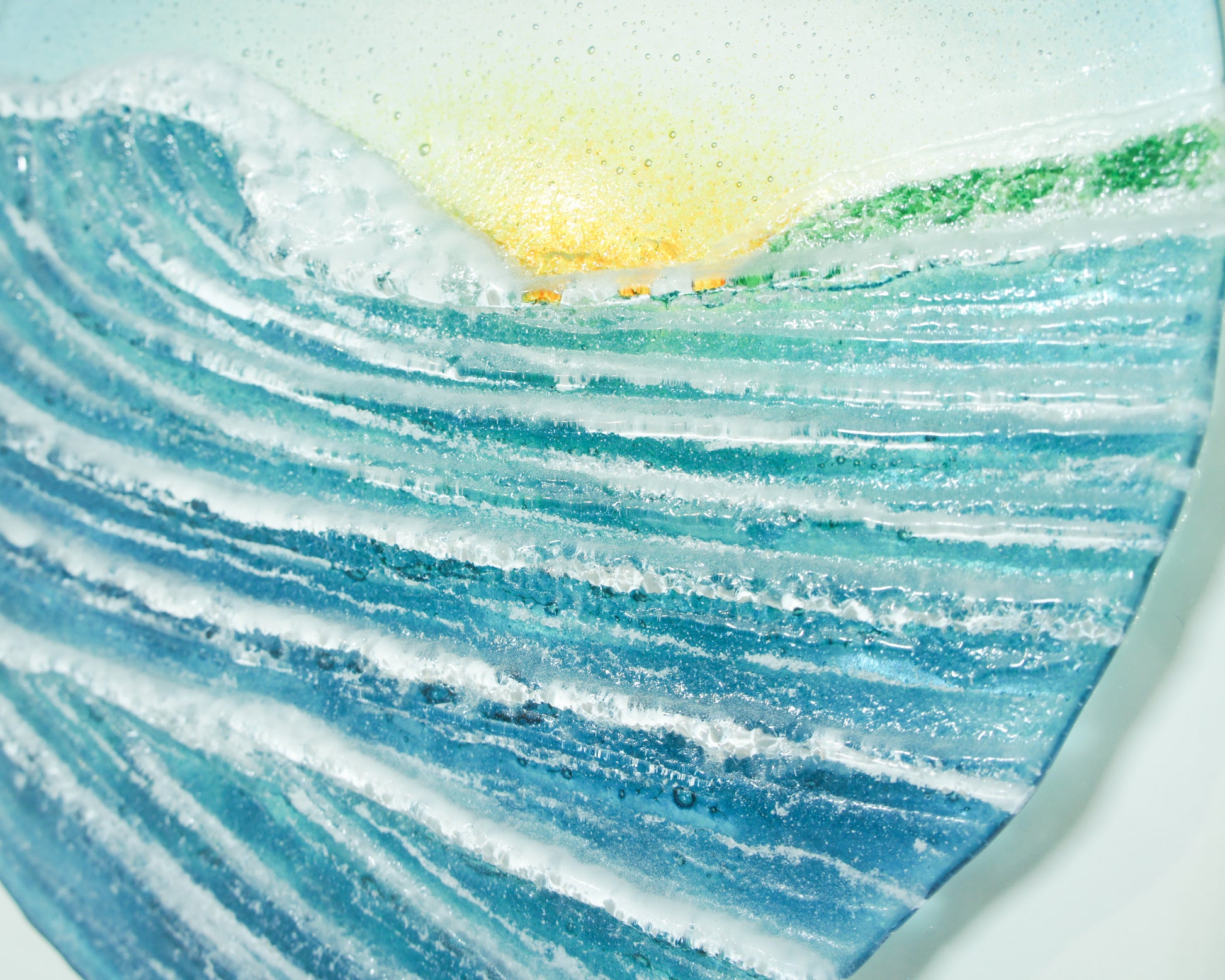This vibrant and smooth round glass panel was designed in 2021, it illustrates a coastal scene with a wave, some land and the sun on the horizon using low relief on the underside and colours to accentuate the motion of the sea and create a dramatic effect. Some parts of the panel are slightly translucent and sandblasted. The sea is in shades of light blues and turquoises, the front of the panel is smooth.